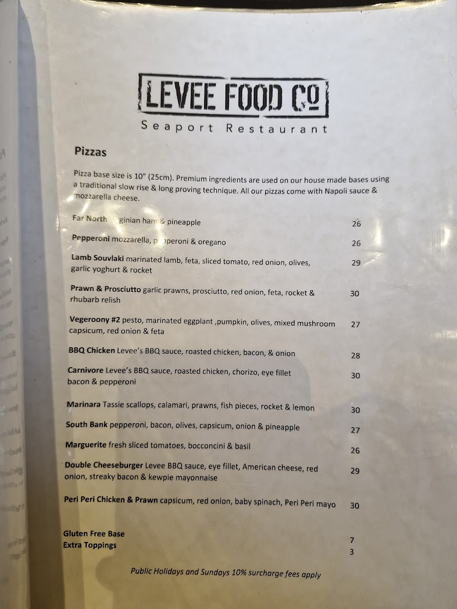 The menu shines with standout dishes like heavenly gluten-free pizzas, and delectable desserts such as the Jaffa Cheesecake and Sticky Date Pudding, ensuring a sweet finish to your meal. Expect attentive service from welcoming staff who enhance your dining experience. Whether you're indulging in fresh oysters or enjoying a casual dinner with friends, Levee Food Co is a must-visit on your next outing.